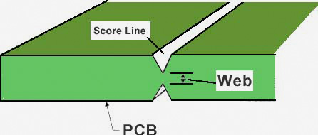 Scoring is a "v" groove cut into the top and bottom surfaces of an array configuration of multiple PCB's or a PCB with removable rails or frame. The cut depth is set such that the material left is the lesser of .018" or 1/3 of the finished thickness. When this process is used the printed circuit boards are typically set up side by side and end to end with no gap between the edges. This results in the v-grove cutting into the area of the boards, so a .015" clearance between the edge of the boards and any conductors is required.